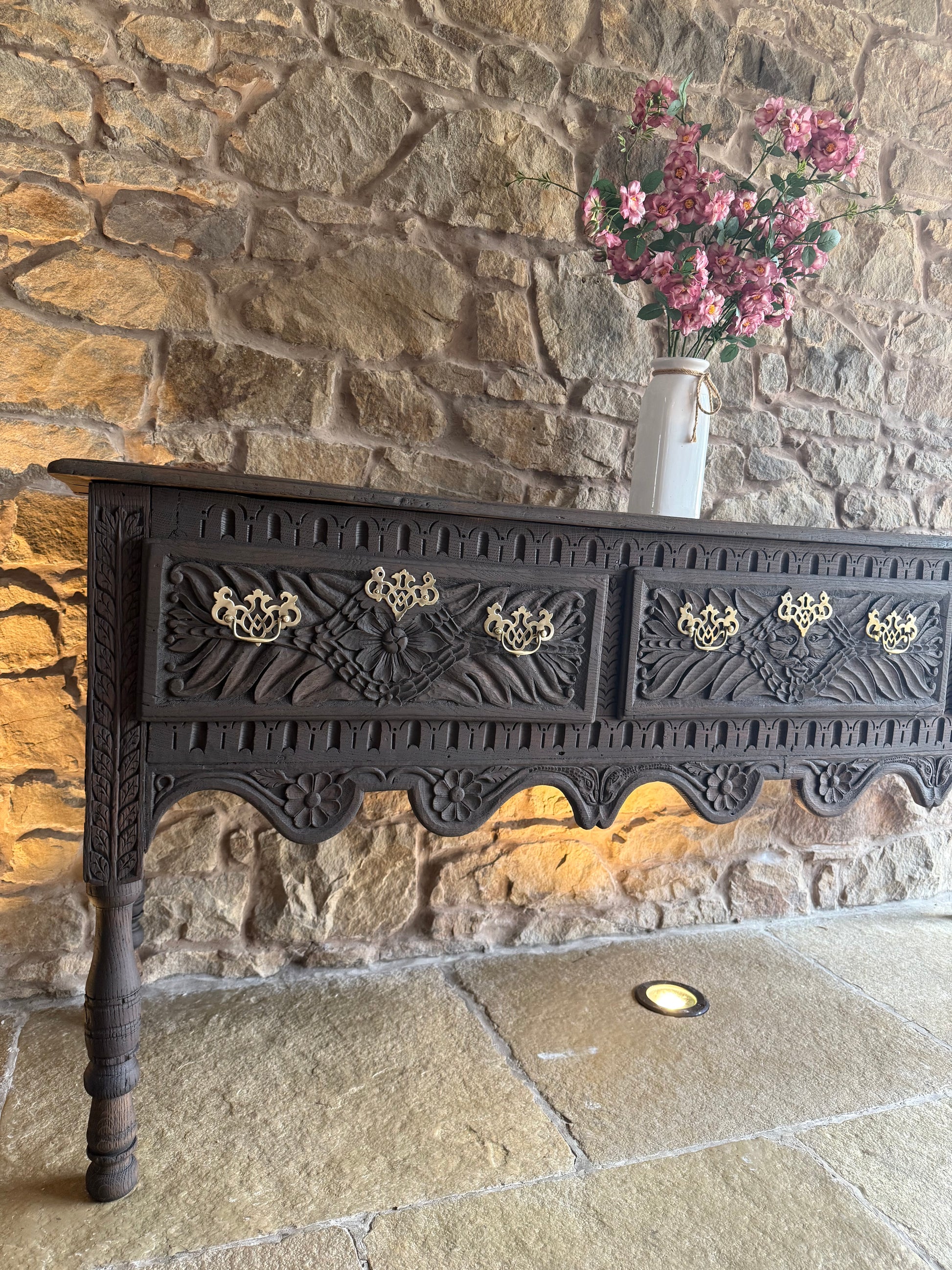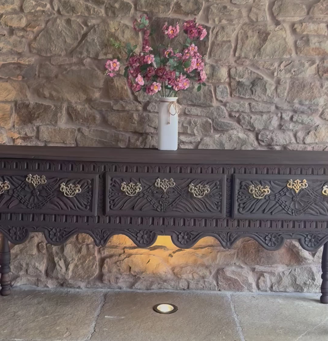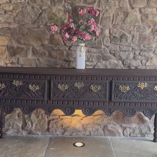 A beautiful Antique Console Table with beautiful carved detailing. All handles have been polished and are antiqued solid brass. This piece has been sandblasted back to raw wood and has been finished in a conditioning and finishing oil. The drawers all open smoothly and have been lightly sanded. A beautiful piece that would look amazing in a period home, or a home looking to add some interesting charm and character.
