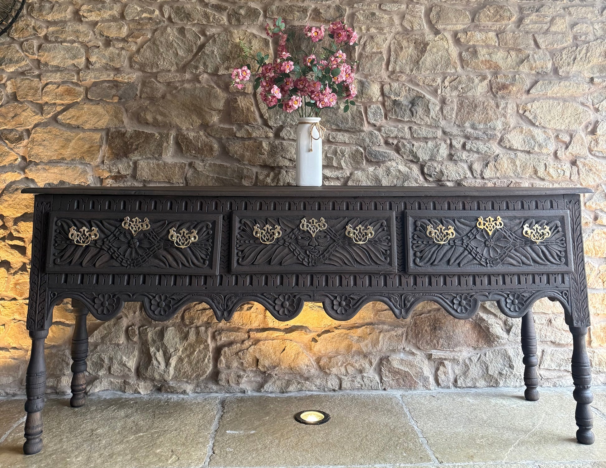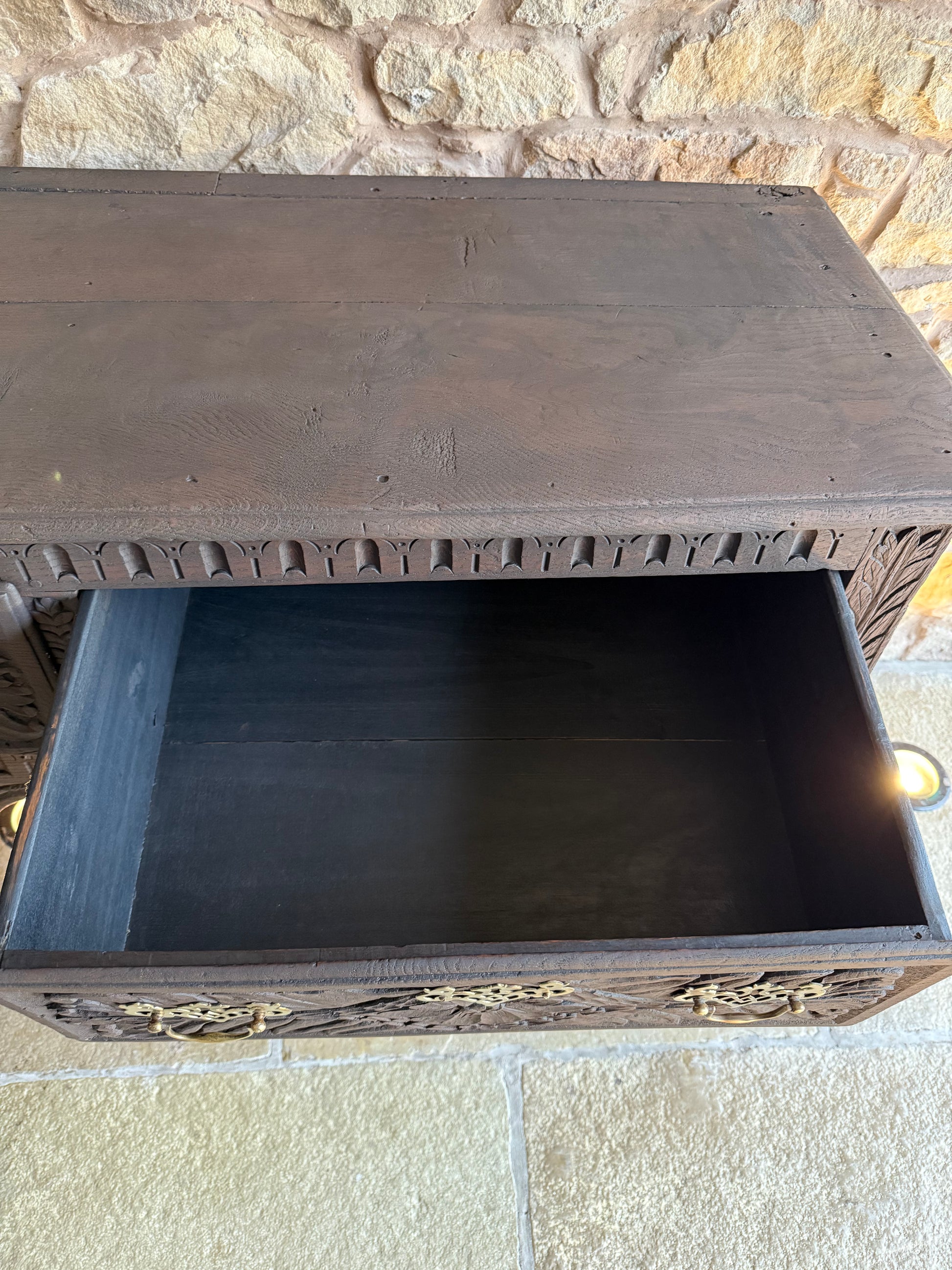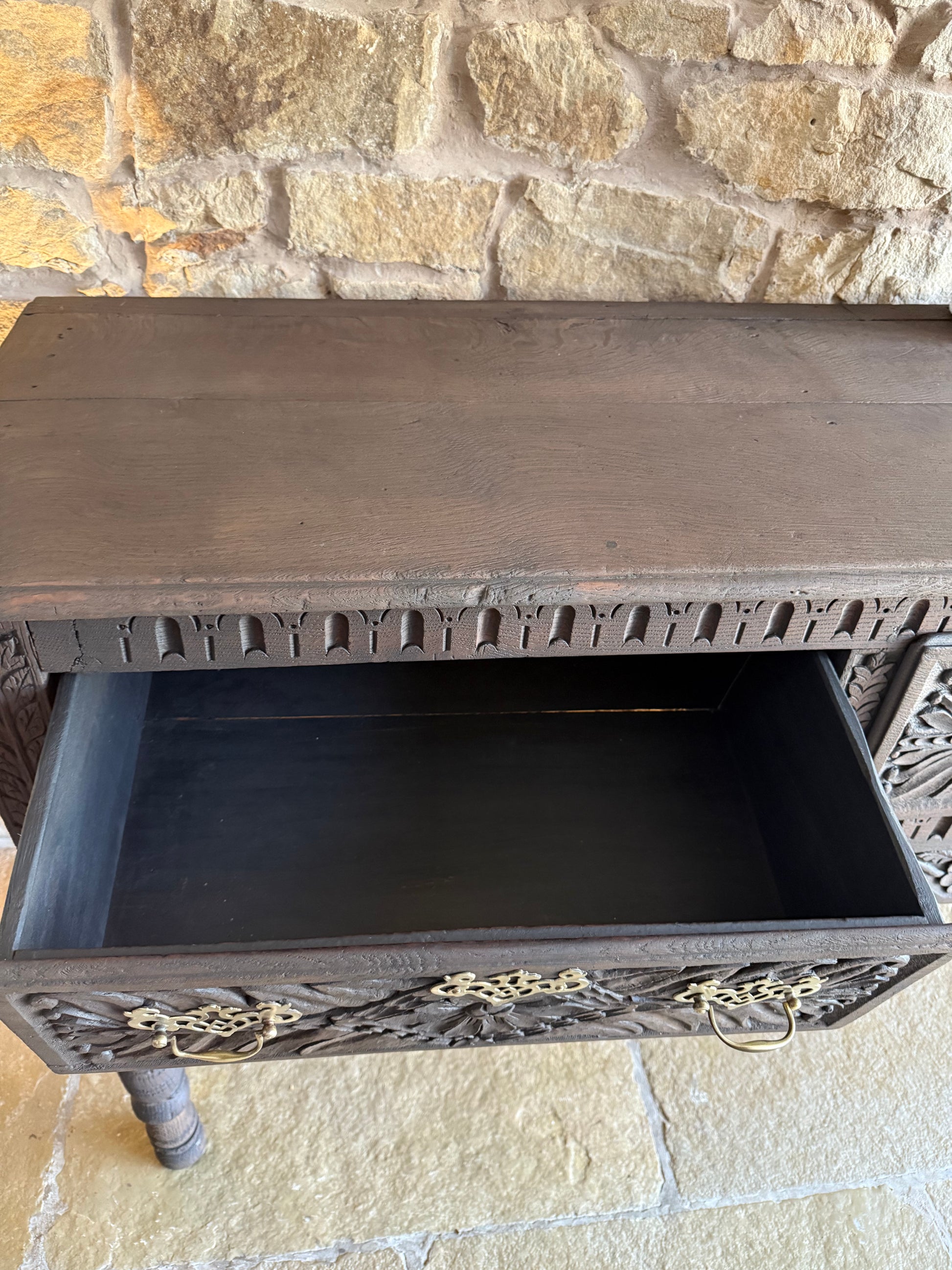 A beautiful Antique Console Table with beautiful carved detailing. All handles have been polished and are antiqued solid brass. This piece has been sandblasted back to raw wood and has been finished in a conditioning and finishing oil. The drawers all open smoothly and have been lightly sanded. A beautiful piece that would look amazing in a period home, or a home looking to add some interesting charm and character.