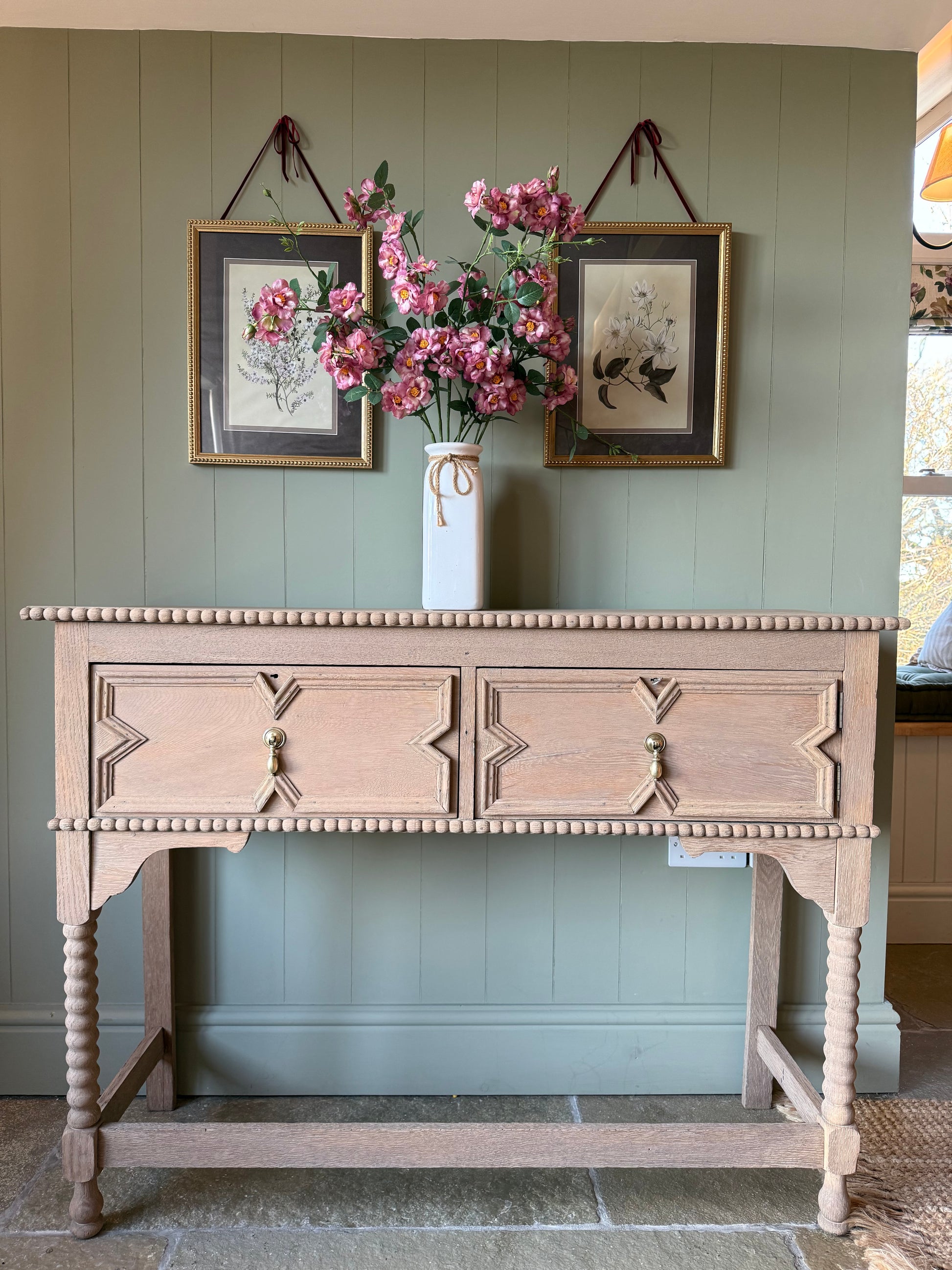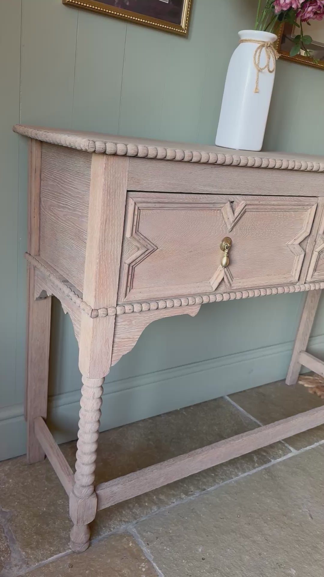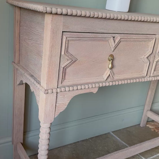 A beautiful rustic console table that has been finished in a lovely natural warm weathered oak style. It has a beautiful design with pretty carvings. It would look beautiful in a period home or a home looking to add some rustic character and charm. There are pretty carvings and two large drawers with dovetail joints with pretty solid aged brass handles. One of the drawers is a hinged drawer.